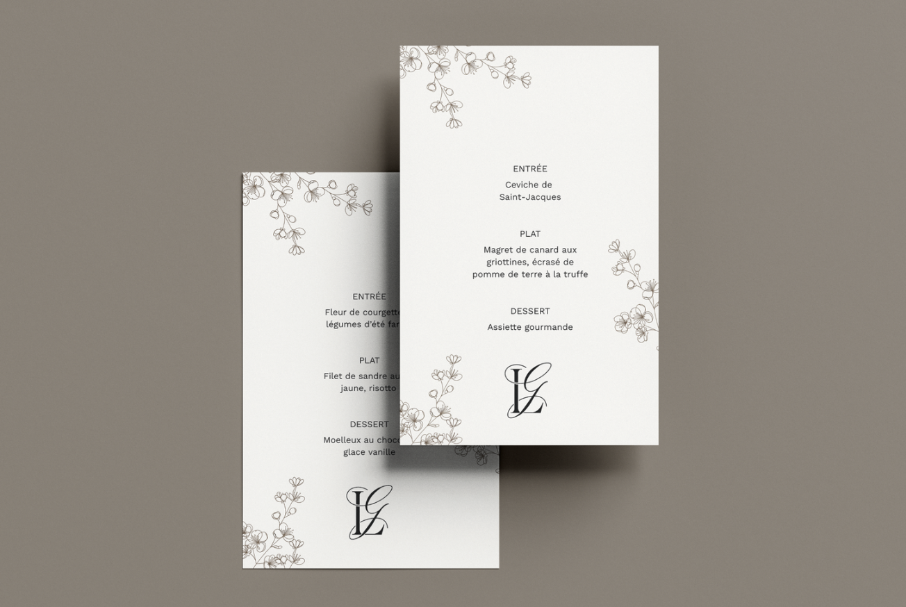 J’ai intégré un logo personnalisé basé sur les initiales de mes parents, L et G, qui a servi de fil conducteur pour l’ensemble des supports.